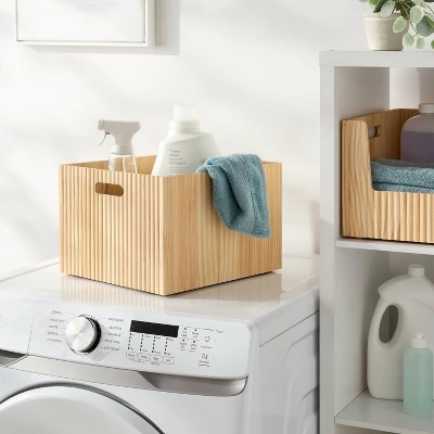 Keep your bath space elegantly organized with the Wood Bin from Brightroom™. This large bin is designed in a rectangular shape with an open top for easy organization of clothing, toys, shampoo, and other items. Made of wood, this rectangle bin features a ribbed-like design at the front for a touch of artistic style. It comes with a cutout handle to make it easy to pull out the bin. You can place it on the tabletop, a shelf, or any flat surface.
